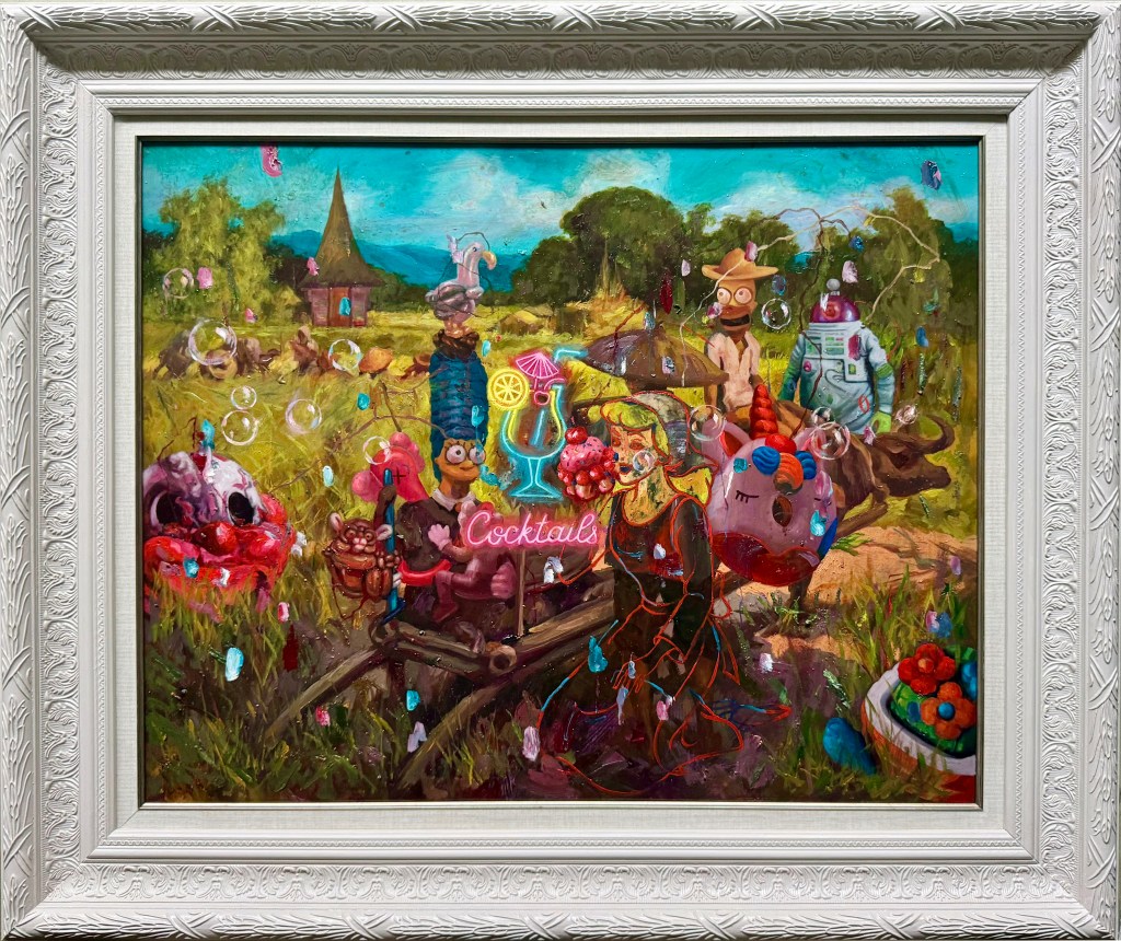 For Culibrina, it is clear that enchantment is not a passive experience. His take on Amorsolo’s works ask us to rethink the past, to question the narratives we’ve been handed about Filipino identity. By embedding global cultural symbols within these quintessentially Filipino scenes, Culibrina invites viewers to consider how external influences shape, and sometimes distort, national identity in a globalized world. “I grew up with these images of rural life,” Culibrina explains, “But as I’ve grown, I’ve realized that the Filipino experience is more complex. It’s not just about nostalgia; it’s about how we adapt, how we blend traditions with modernity, and how we navigate an increasingly interconnected world.”