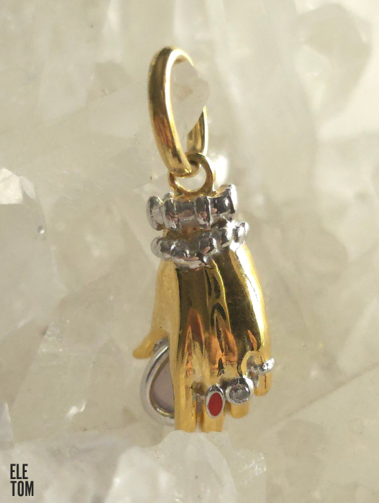 She picks up one of the charms once again,lifting it up for inspection. This time, it’s a mini chandelier pendant with so much detail that you would think it’s a piece from one of those Victorian dollhouses outfitted with mini porcelain china plates. According to her, the design was her take on creating something witty, tongue-in-cheek: “We wanted to make it a little bit more special with the design, old-school but timeless.” she says, while lifting the chandelier pendant up for closer inspection