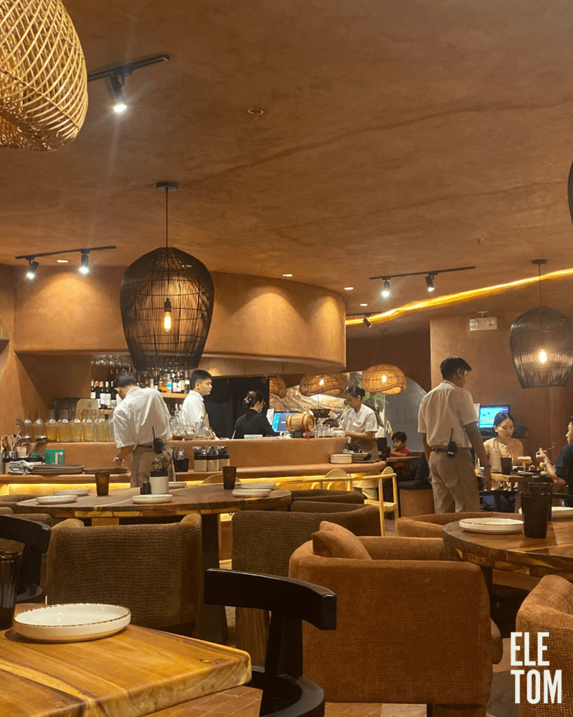 Stepping into the restaurant, I was immediately struck by the warm and inviting ambiance. The terracotta orange façade, starkly contrasting to the dark wooden colours utilized, felt like a welcoming embrace into the sala of someone’s home ( sala is a Spanish word for living room or reception hall). The cave-like setup, reminiscent of Andalusian cave houses, and the charming abaca lamps added to the homely feel, making it a perfect spot to relax with friends.