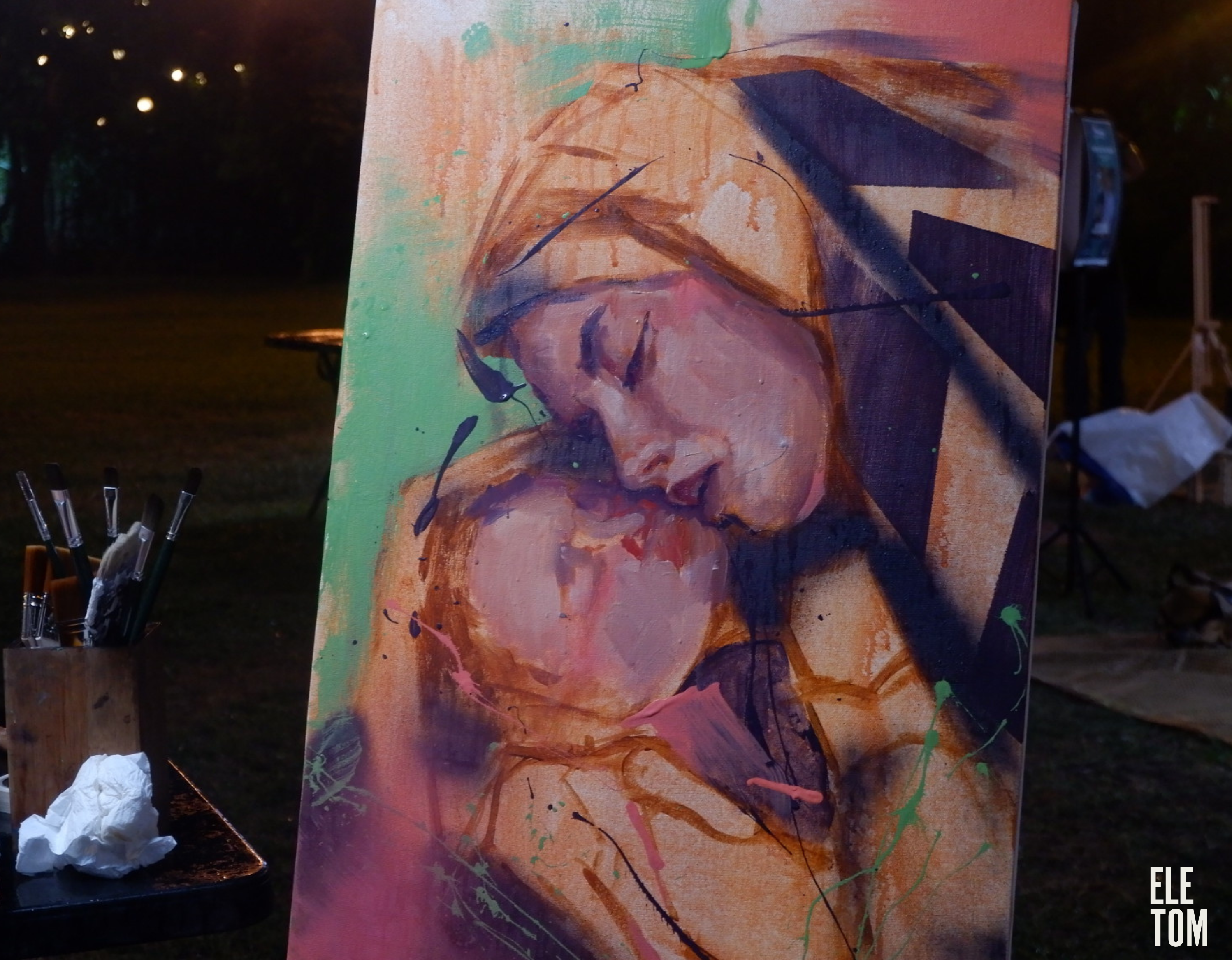 Painting under a drizzle of rain, the Battle of the Brush commenced. At the same time, music played in the background, for this selection of talent, Nyuda paired emerging and established artists, all equally matched in teams of two, creating unique artworks that demonstrated their respective styles on two easels. It later ended in good fun with each artist kicking back and joining in the festivities.