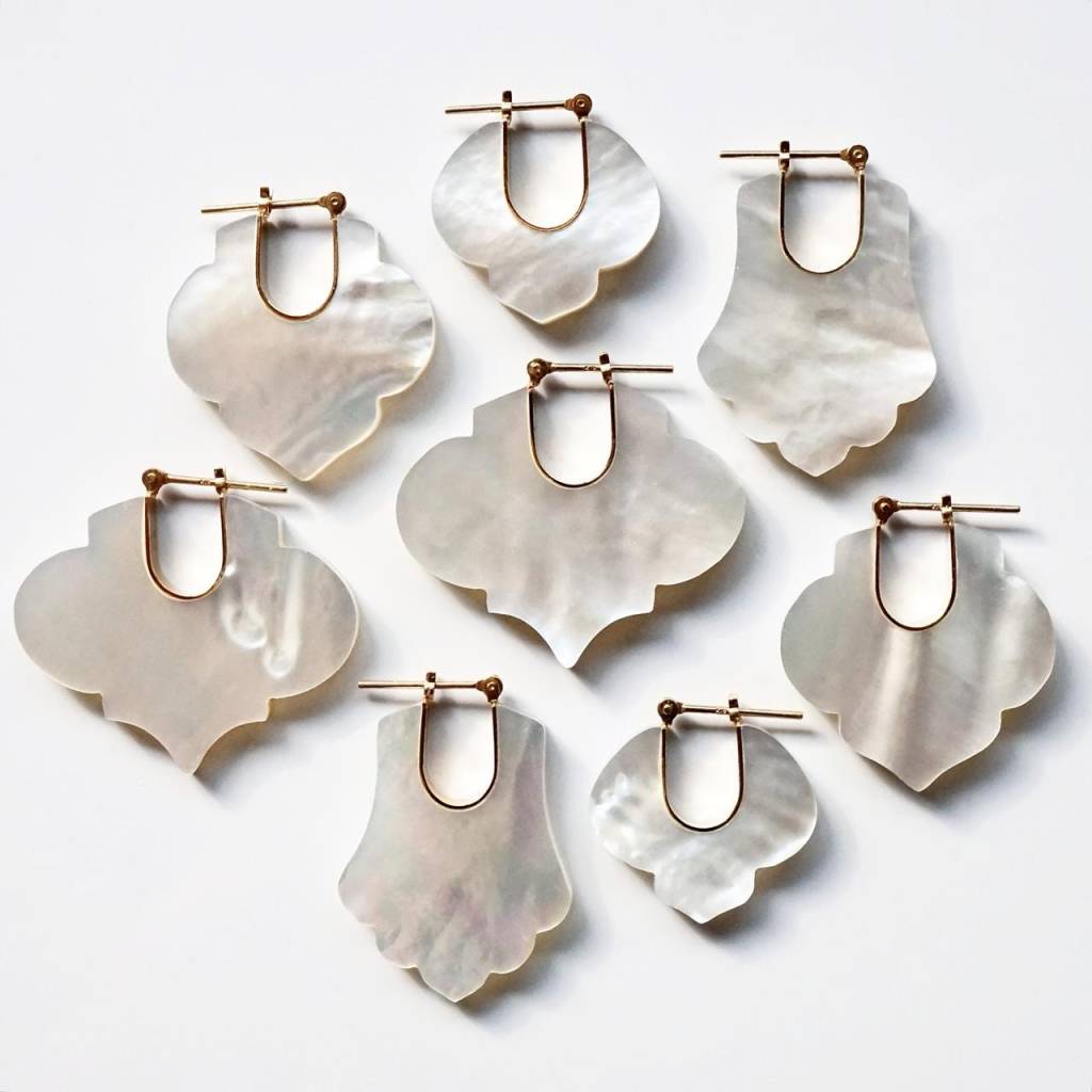 Talkative’s emblematic earrings are created by Shinobu Marotta in collaboration with Japanese master artisans, using carefully cut mother-of-pearl lined with yellow gold.