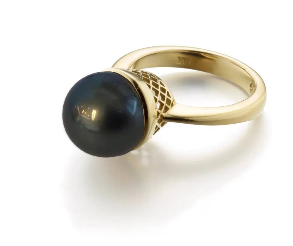 Subverting the pristine image of creamy white pearls, Ray Griffiths chooses a perfect black pearl for this minimalist statement ring, bezel-set into a gold crownworkⓇ mount.