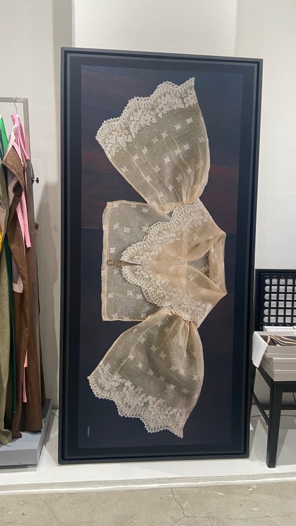 Racks and shelves of clothing on each side of the space, along with Bitagcol’s artwork, such as framed camisas, further unveil their art, from Ivarluski’s unisex separates to Jo Ann’s updated classics. This highlights the designers’ exceptional work and meticulous attention to detail.