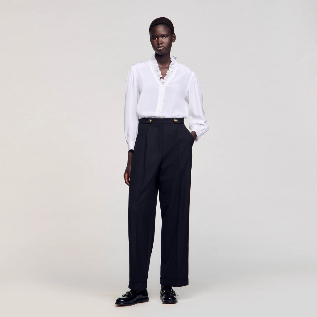 The look isn’t about brand names so much as fit. Mid- to high-rise pants deliver the same streamlined effect when made from structured fabrics like wool blends, crepe or twill, rather than thin or stretchy materials.