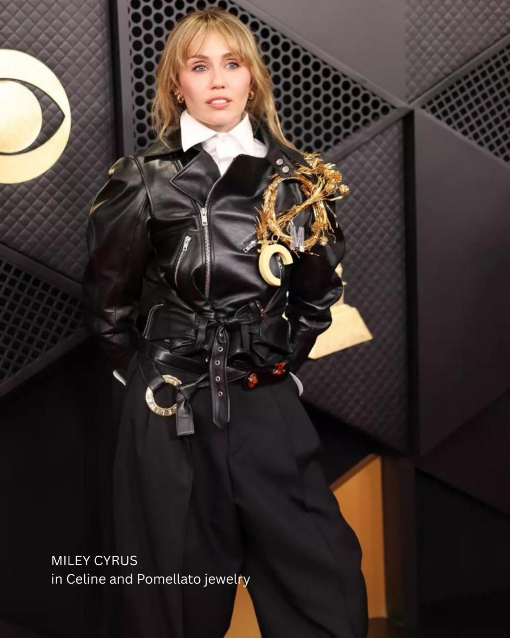 Miley Cyrus always knows how to make an entrance. This year, her appearance at the Grammys did not disappoint. Clad in all black and white jacket and trouser get-up from Celine, Cyrus turned heads, especially with the giant custom gold brooch over her chest.