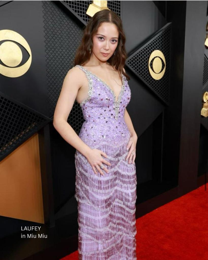 Our favorite Icelandic-Chinese singer stunned in a soft lavender Miu Miu mermaid gown, diamond drop earrings from Jared Atelier, and we can’t get enough of it. Laufey won her second Grammy that night for Best Traditional Pop Vocal Album for A Matter of Time, her third album, released in August 2025.