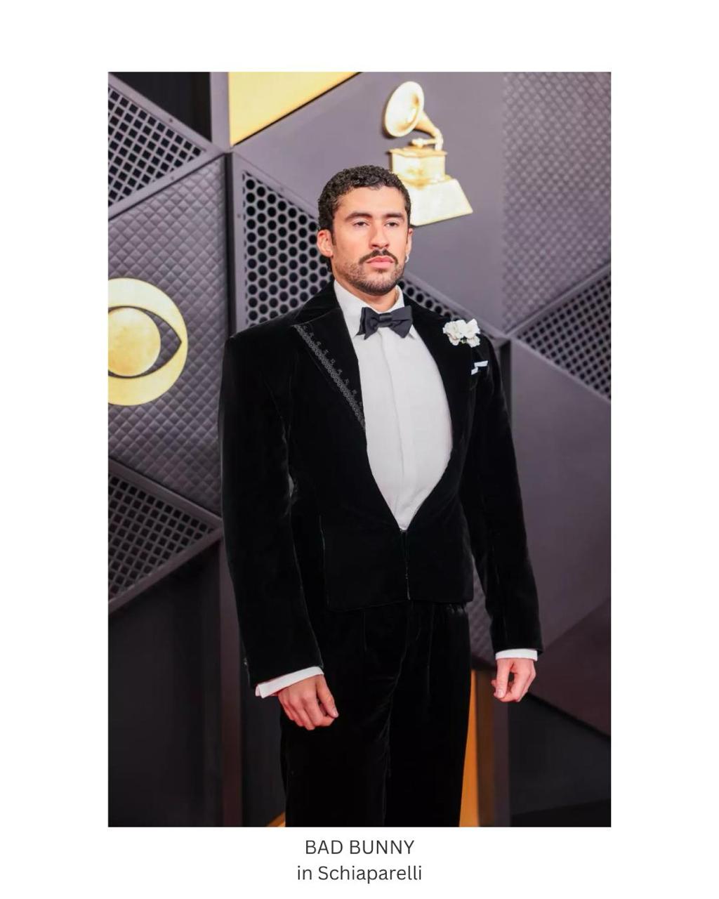 Grammy Award-winning singer-songwriter, BAD BUNNY, made history that night by winning the Album of the Year award. ‘ Débi Tirar Más Fotos’ was the first Spanish-language LP that won the Recording Academy’s most prestigious prize. All while looking sleek and edgy in a custom Schiaparelli smoking ensemble,