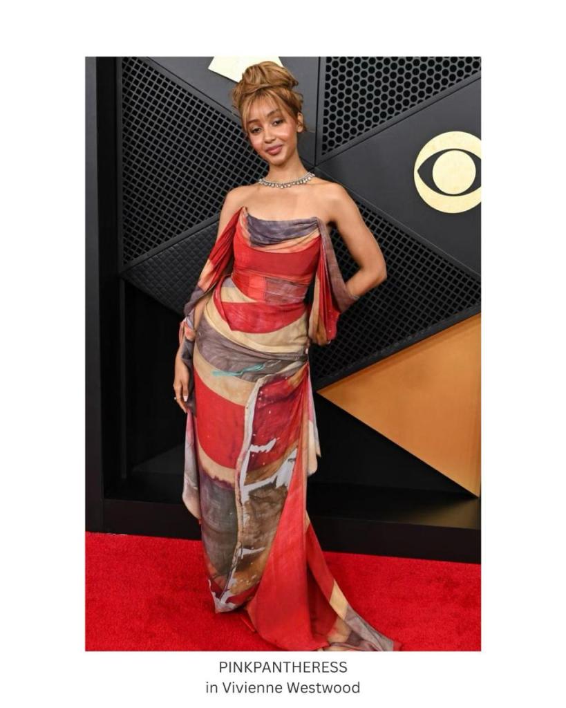 Last but certainly not least, First-time Grammy nominee PINKPANTHERESS turned heads wearing an archival Vivienne Westwood scarf dress that carried subliminal messaging about the singer’s British heritage.
